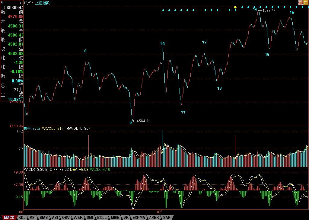 由于收盘,使得16开始的17段走势是否完成,无从判断,因此,明天一大早的走势就是决定该线段结束的位置,如果在图中10之下(也就是4645点下),那么将成一个5分钟的中枢,(8-11)+(11-14)+(14-17)。