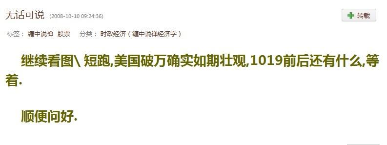 “虽然理论是本ID个人发现发明的,但本ID的理念从来都是知识是全人类的,个人不应当藏着掖着,所以本ID把理论逐步公开,只是为了知识是全人类这个信念,和任何的同情或怜悯无关,因此学习得益的也不需要感谢本ID,就像你学会了平面几何,也不需要去感谢欧几里德。至于有人要千方百计去证明平面几何的错误,那也是无所谓的,这总比打麻将和傻忽忽跑到股市中亏钱强,对本ID的理论也是一样的。 ....... 说实话,站在本ID私人角度,本ID是彻底欢迎一个大的亚洲金融风暴,至少本ID这次就可以买到比现在便宜一半的房子,而且本ID一直仓位极轻,基本就是空仓,所以本ID并不介意出现一千几百点的位置,想想那时候,60元走的中铝6元买回来,病都马上要好了。但是,站在国家利益的角度,站在全民利益的角度,肯定不能这样的,而现在本ID的所为,其实是损害私人利益的,但这并不是本ID所介意的。