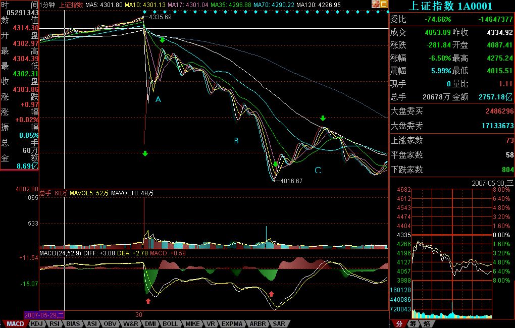 本来不想说股票的,但知道现在说其他,大多数人也反应迟钝,被股票所迷惑了,所以还不如将错就错,就继续股票一把,说说昨天这530印花税当日行情如何去当下地分析。 本来这个问题十分简单,而且本ID一大早7点不到就发帖子提醒要在第二、三卖点把仓位减掉,很高兴看到不少人都能发现9点48那第二类卖点。注意,为什么同时强调第三类卖点,因为有些特别弱的股票,可能就是一个第三类卖点,大盘的走势是一个平均走势,而且当天比很多个股都强,所以大盘是第二类卖点,并不意味着个股是第二类卖点。