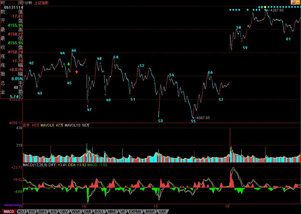 今天的走势昨天已经说得很清楚,4224点下不出现第三类卖点,就是强势震荡。今天的走势,显然符合这个要求。4224点,就是上图61这位置,从60开始的1分钟中枢[4224,4254],今后两天就看这中枢的第三类买卖点。换言之,还和昨天说的一样,只要不在4224点下出现1分钟级别的第三类卖点,那就是强势,至于大盘要展开新一轮上攻,就要在4254上出现1分钟级别的第三类买点,否则大盘就在该区间内震荡继续中枢震荡延伸。
