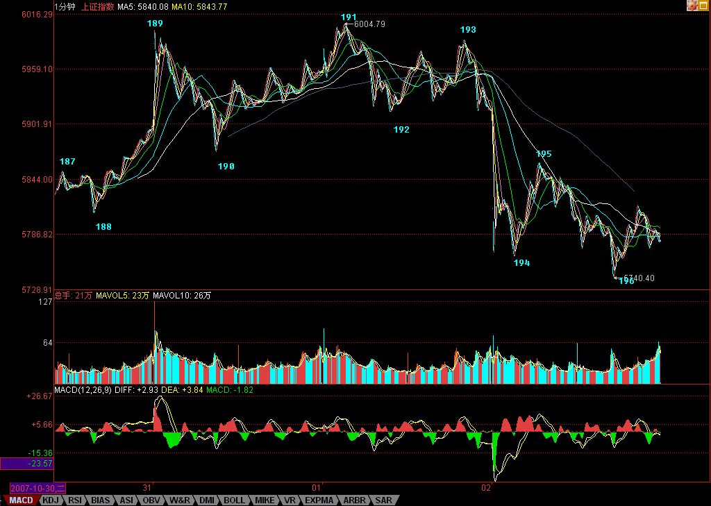 因此,当各位熟练以后,标记上就不一定要不断地标记下去了,例如,如果你是按1分钟级别操作的,那么,前面191个线段记号,可能就可以一下简化为10个不到的1分钟级别相关的记号。当191后面的走势演化出的1分钟走势结束后,这1分钟级别的记号才再增加一个,这样,记号的数目就很有限了。当然,如果是5分钟级别、30分钟、日线等等,就更少了。