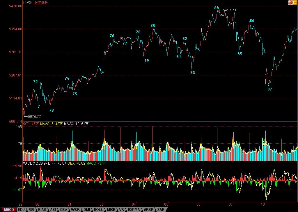 图形上,76开始的5分钟中枢异常明确了,在该中枢的第三买卖点出现前,中枢震荡将一直延续。